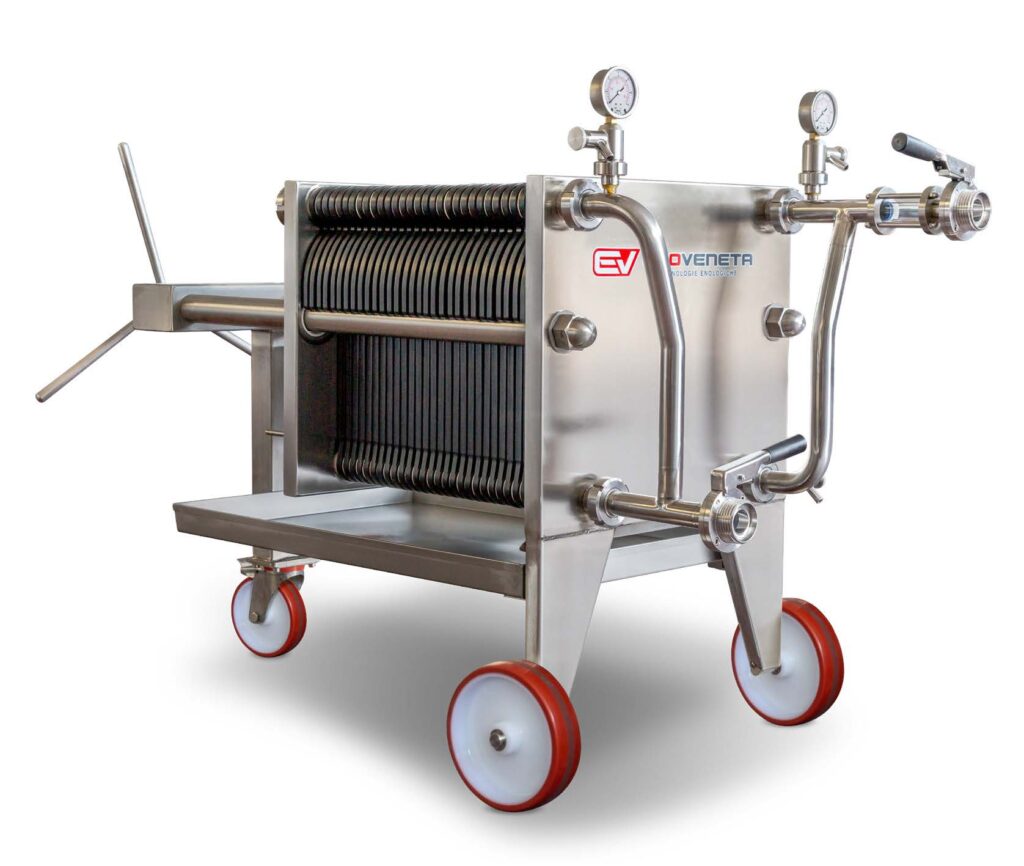 Réalisation en acier inox 304L sur roues, série de plaques horizontales avec toile reps, série de vannes papillon, manomètres indiquant la pression à l’entrée et à la sortie du produit, pompe d’alimentation de type centrifuge et pompe de dosage à membrane à débit variable.