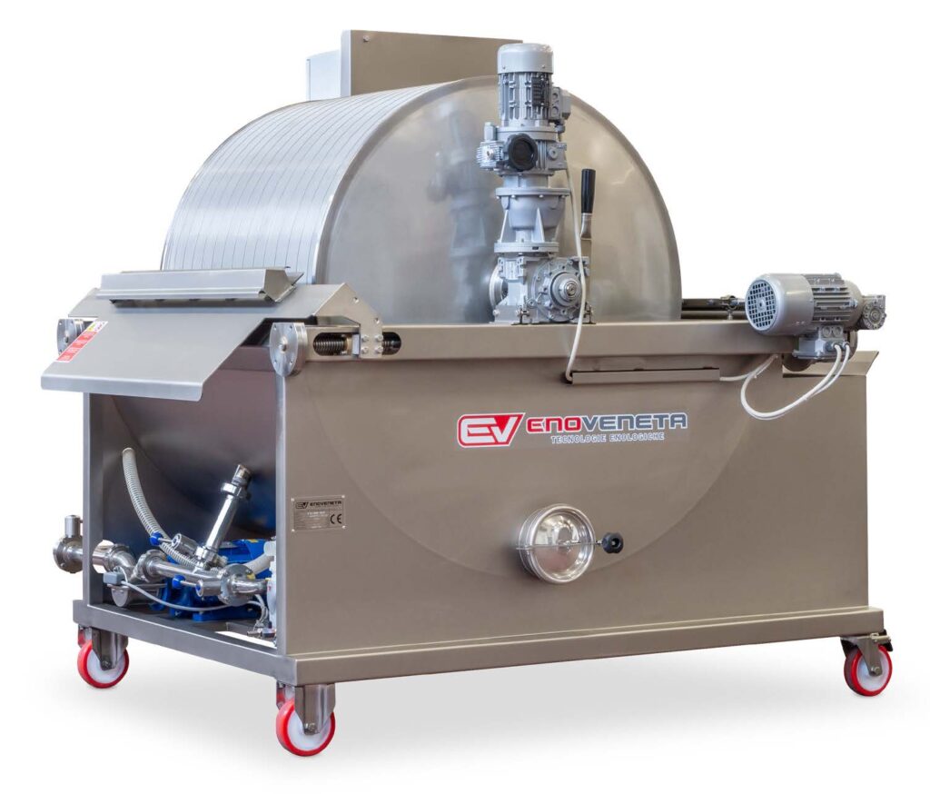 Réalisation en acier inox 304L sur roues, tambour recouvert d’une toile reps, série de vannes papillon, manomètre, pompe d’alimentation de type centrifuge, pompe à vide en fonte, pompe d’extraction immergée à l’intérieur du tambour, avancement automatique de la lame qui coupe le gâteau, réservoir pour la préparation de la suspension adjuvante de filtrage, lavage du tambour, tableau électrique.
