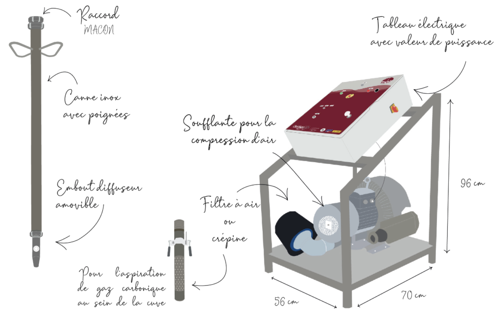 L’équipement se compose d’une soufflante qui peut être fixée sur un socle, sur un meuble support ou sur un mur ainsi qu’une canne inox d’une longueur pouvant varier de 2 mètres à 3,50 mètres, suivant la profondeur des cuves.