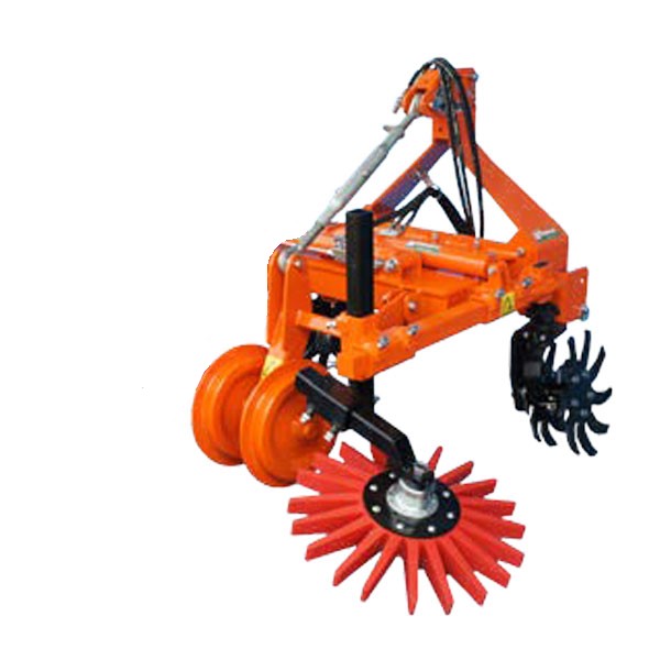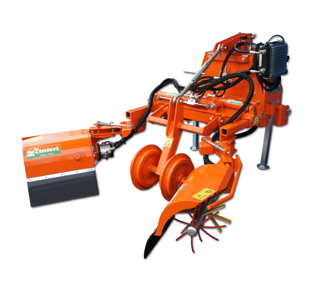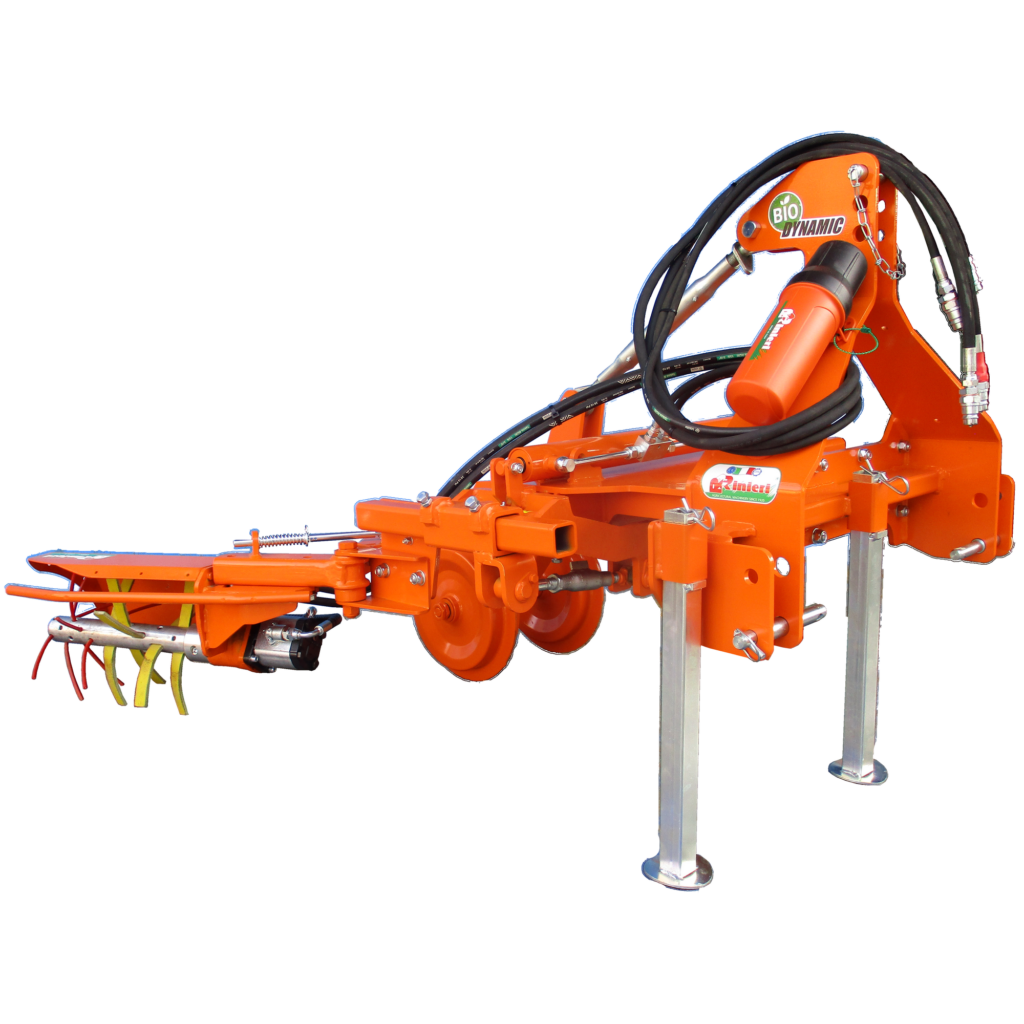 Châssis Bio-dynamic arrière ou avant avec roue tondeuse interceps avec ressort de rappel, diamètre 65cm. Il est équipé d’un mouvement latéral hydraulique qui lo rend particulièrement adapté à la coupe de l’herbe dans les plantations intensives et les vergers à branches très basses. Sur le même cadre, il est possible d’appliquer d’autres outils de travail : ébourgeonneuses – Bio Star.