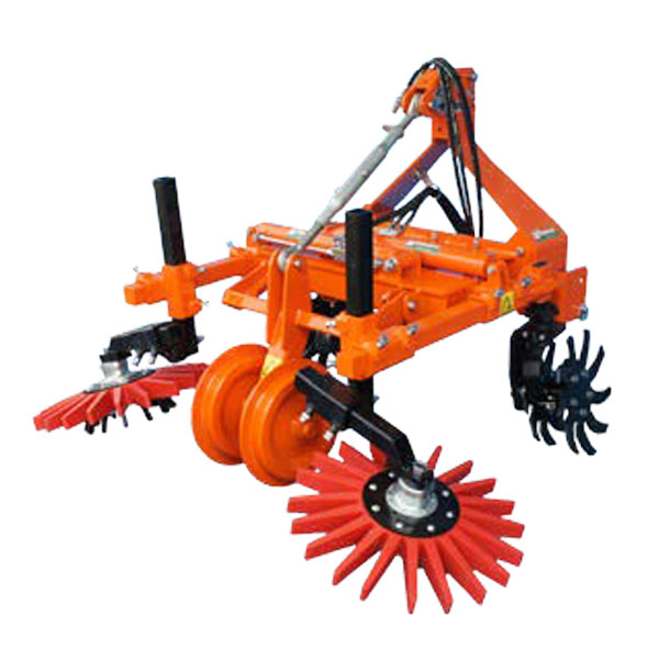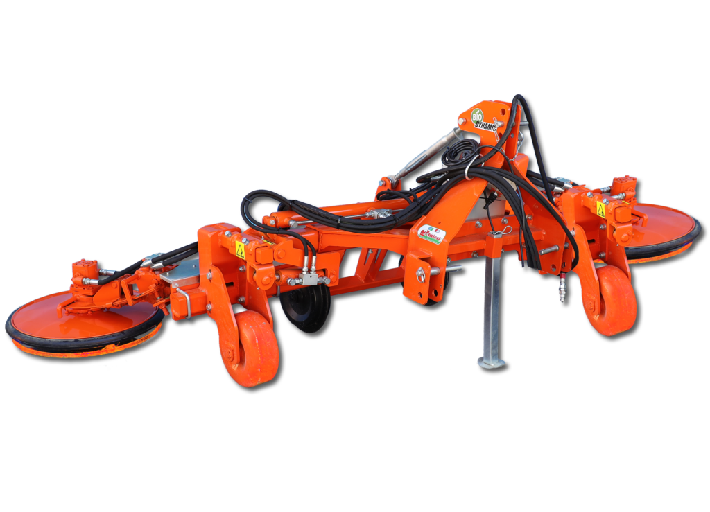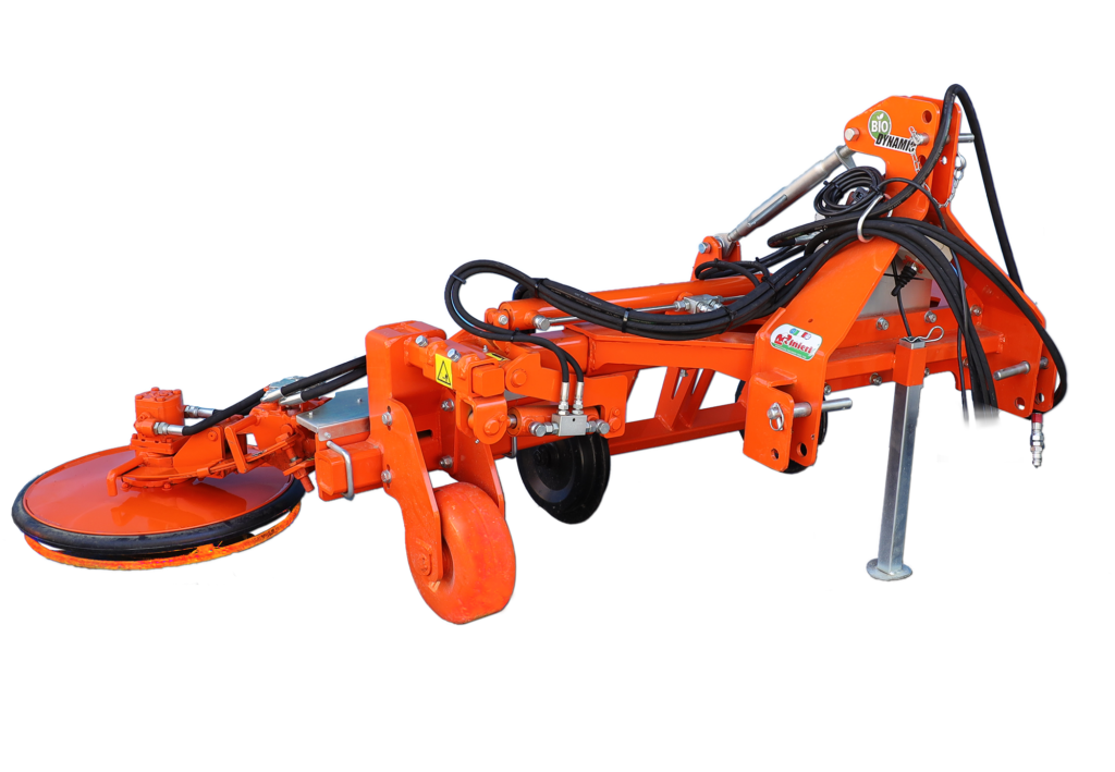 Châssis Bio-dynamic double, arrière ou avant avec roue tondeuse interceps avec ressort de rappel, diamètre 65cm. Il est équipé d’un mouvement latéral hydraulique qui lo rend particulièrement adapté à la coupe de l’herbe dans les plantations intensives et les vergers à branches très basses. Sur le même cadre, il est possible d’appliquer d’autres outils de travail : ébourgeonneuses – Bio Star.