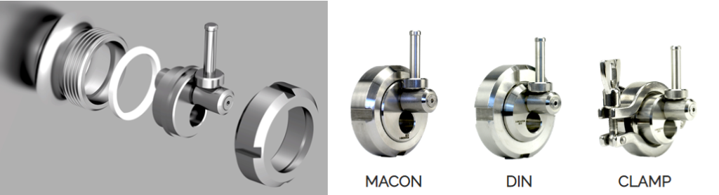 Il est important d’utiliser des raccords de qualité alimentaire pour éviter la contamination de la cuve. Celles-ci sont facilement démontables, les zones en contact avec le vin sont lisses et accessibles, permettant un nettoyage rapide et sans relâche. Le robinet de dégustation HECLIPSE offre ces avantages en trois versions : MACON, DIN et CLAMP.